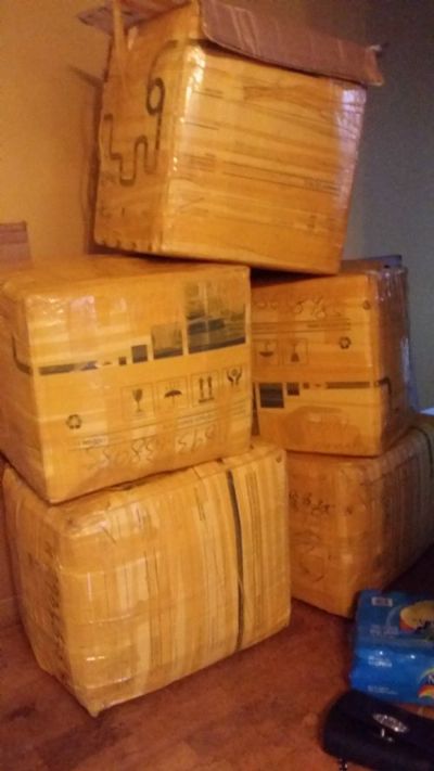 门到门服务,从家里取货到送货上门也就是一个星期吧。当中开箱检查,东西都没有丢失的,挺好的,如果老客户可以有更多优惠就更好了呦!!箱子可能被加拿大海关开箱检查过,外面被黄色封箱胶缠的相当严实,已经完全看不清单号了,不过还是可以看得出是海龙提供的啦。