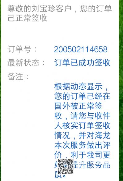 因为是第一次在海龙国际邮寄东西。所以操作程序和步骤不熟悉。海龙国际客服黄小姐Aimee耐心细致,不厌其烦地反复指导。为了方便交流指导她主动加了我的微信。不怕笑话本人笨(老人60多岁),理解反应慢。在微信聊天记录里黄小姐Aimee共发了文字信息68条。每个步骤指导操作。非常感谢! 5月2号顺丰上门取件。5月7日海龙国际交由航空公司。昨天晚上美国的女儿就发图片收到了包裹。疫情非常时期。这么快就收到了包裹,有点意外惊喜。 值得信任。以后邮寄包裹首选海龙国际快递。很满意的一次体验。谢谢有关工作人员。