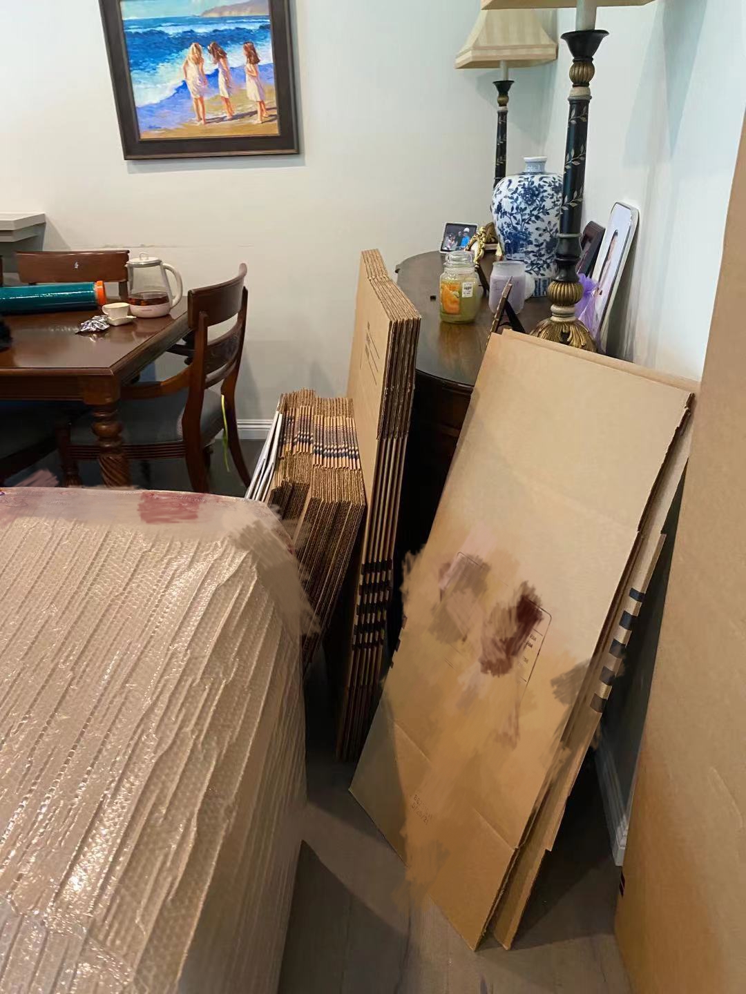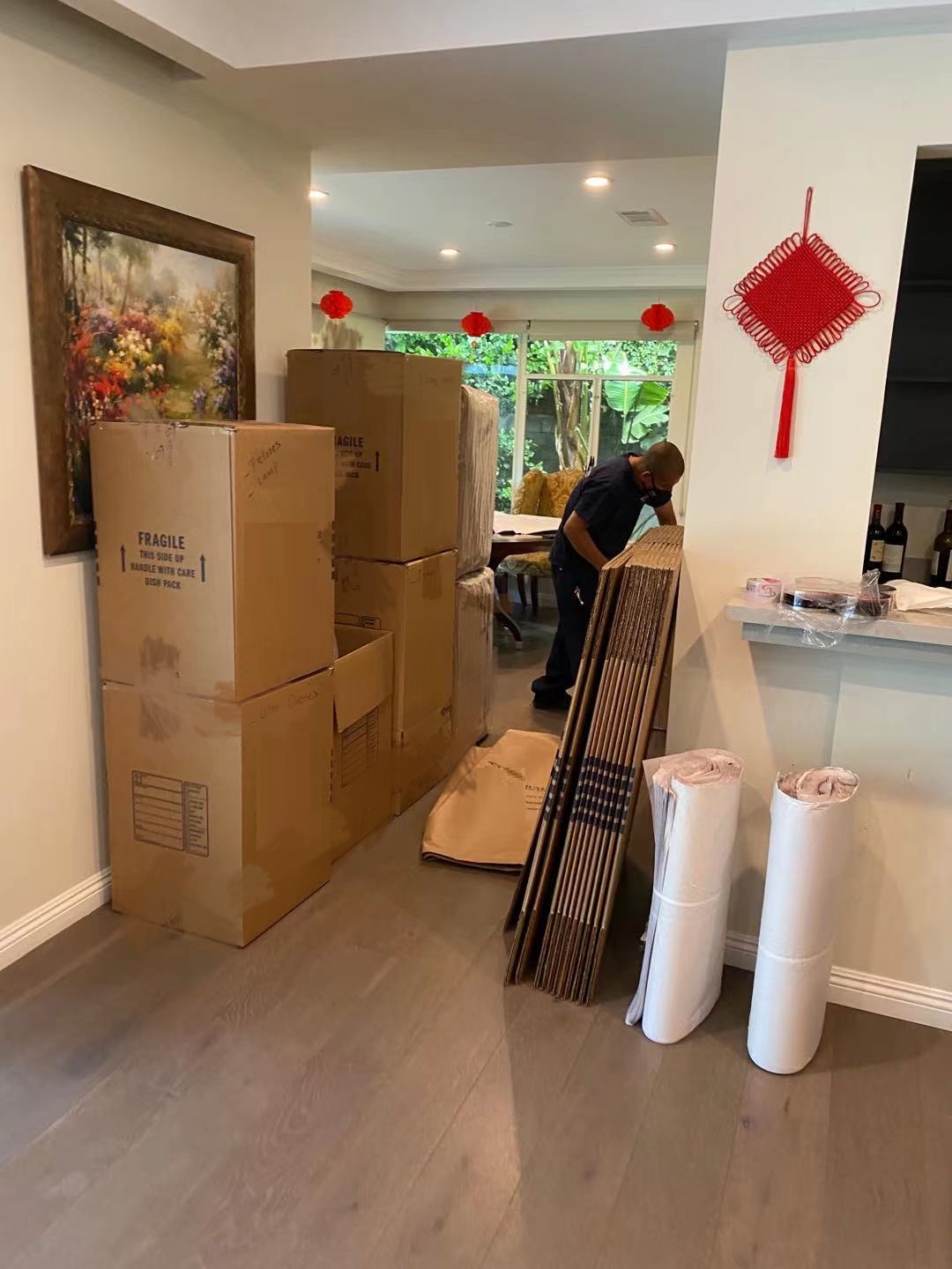 历经三天时间,工人终于将我所有的物品都打包好,装好车了。决定要回国发展,委托海龙把整家的家具行李都运输回上海,要运一个40GP,没想到刚刚好全部装满。都是这么多年来在美国生活积累下来的家当了,也舍不得处理掉,只好全部都运回去,有三角钢琴,有大理石餐桌,好几张沙发,还好海龙之前来做过评估,也提前先帮我定制了木箱,我看我这些家具,包装保护做得还是比较好,相信海龙工人的专业。三天都在打包,搬家确实是一门累人的活,我看工人们都勤奋地打包,用他们的专业包装工艺,出色地完成我这次搬家的打包工作,实在太辛苦他们,也太谢谢他们了,希望接下来一切都顺顺利利~