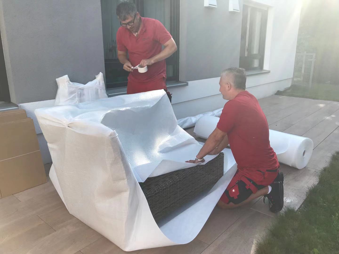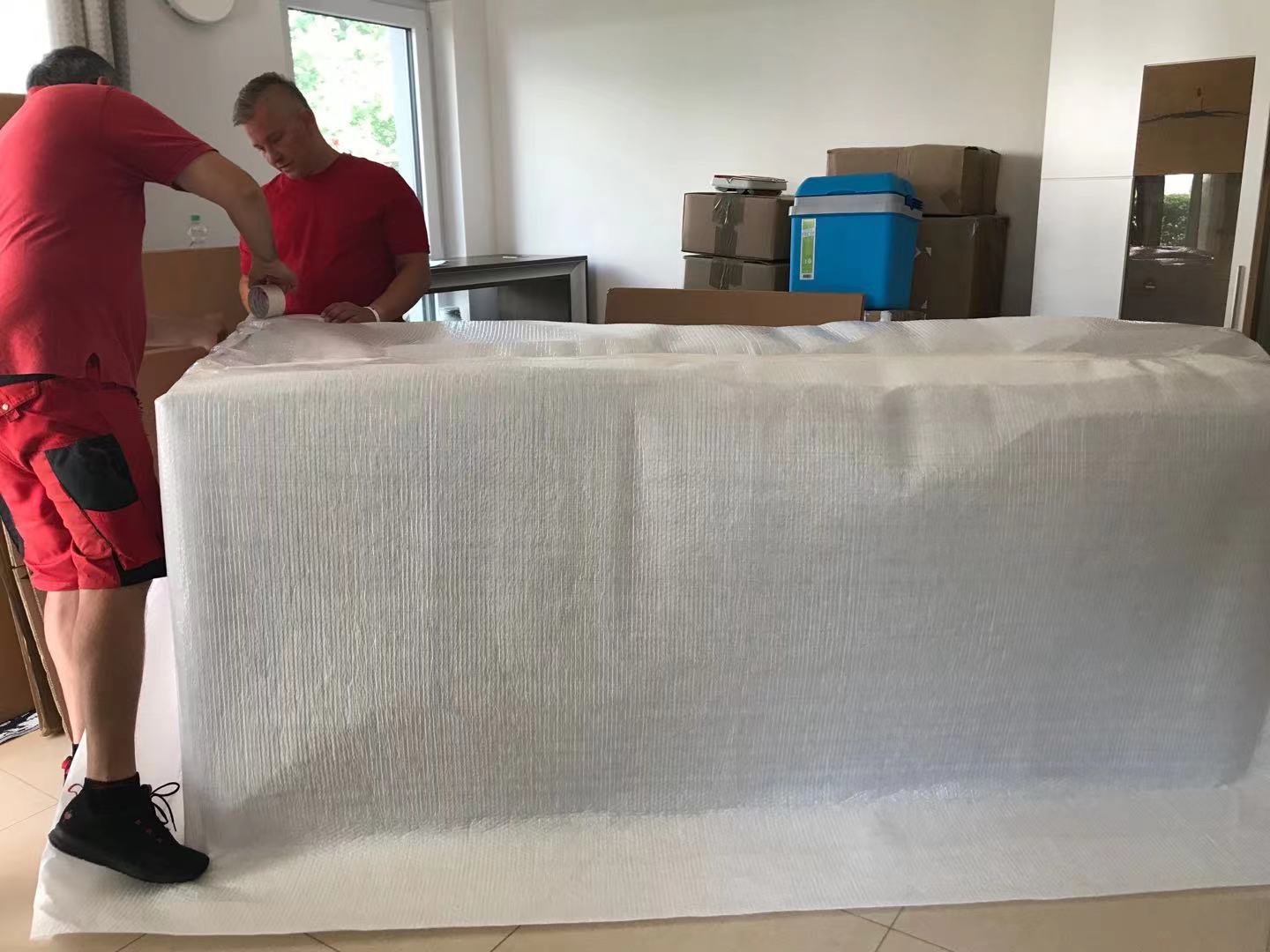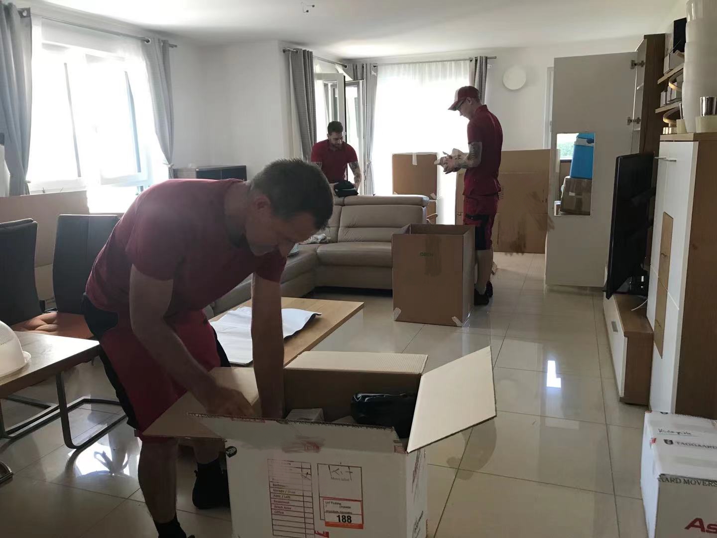 上门打包是外国人,都穿了工作服,几个老外也是很热情幽默,干起活来也一点都不含糊,我的衣服,厨具,小家电都装进纸箱,堆得整整齐齐的,几样家具也包得严实,走之前还帮我清理了打包现场,很nice。