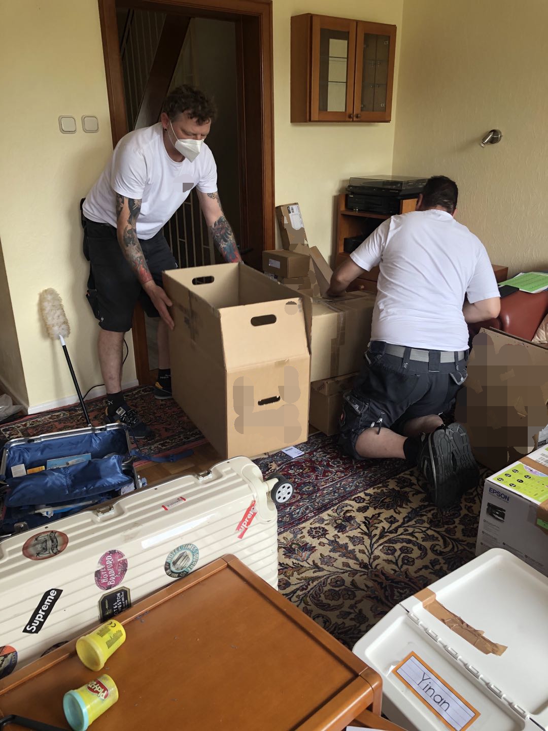 今天天气很不错,德国下了一个多星期的雨,终于在我们搬家的这一天放晴了, 真的是太好了~~2个打包师傅按照约定的时间, 准时来到我们家门口。开门一看, 是德国最大的一家国际搬家公司呢, 实在是很惊艳, 专业的包装材料逐一搬进屋里, 师傅们娴熟的包装手法也是震惊到我了, 疫情期间,他们都能戴着口罩这么卖力地做打包, 实在是太难得了。我们家的行李是真的太多了, 师傅们还是很细心地打包好这些易碎的碗碟玻璃杯子, 逐件用白纸打包, 还用了很多防撞缓冲的珍珠棉去填充。我的衣服就更多了, 我提前用防潮袋装好, 他们按照大人/小孩这样分别装箱,写清单。 非常认真!今天的打包, 真的是辛苦他俩了, 足足包了4个小时呢。每个箱子都整整齐齐地码放在门口, 下心地搬上货车, 终于都运走了。。。。。我的宝贝们, 我们中国见!